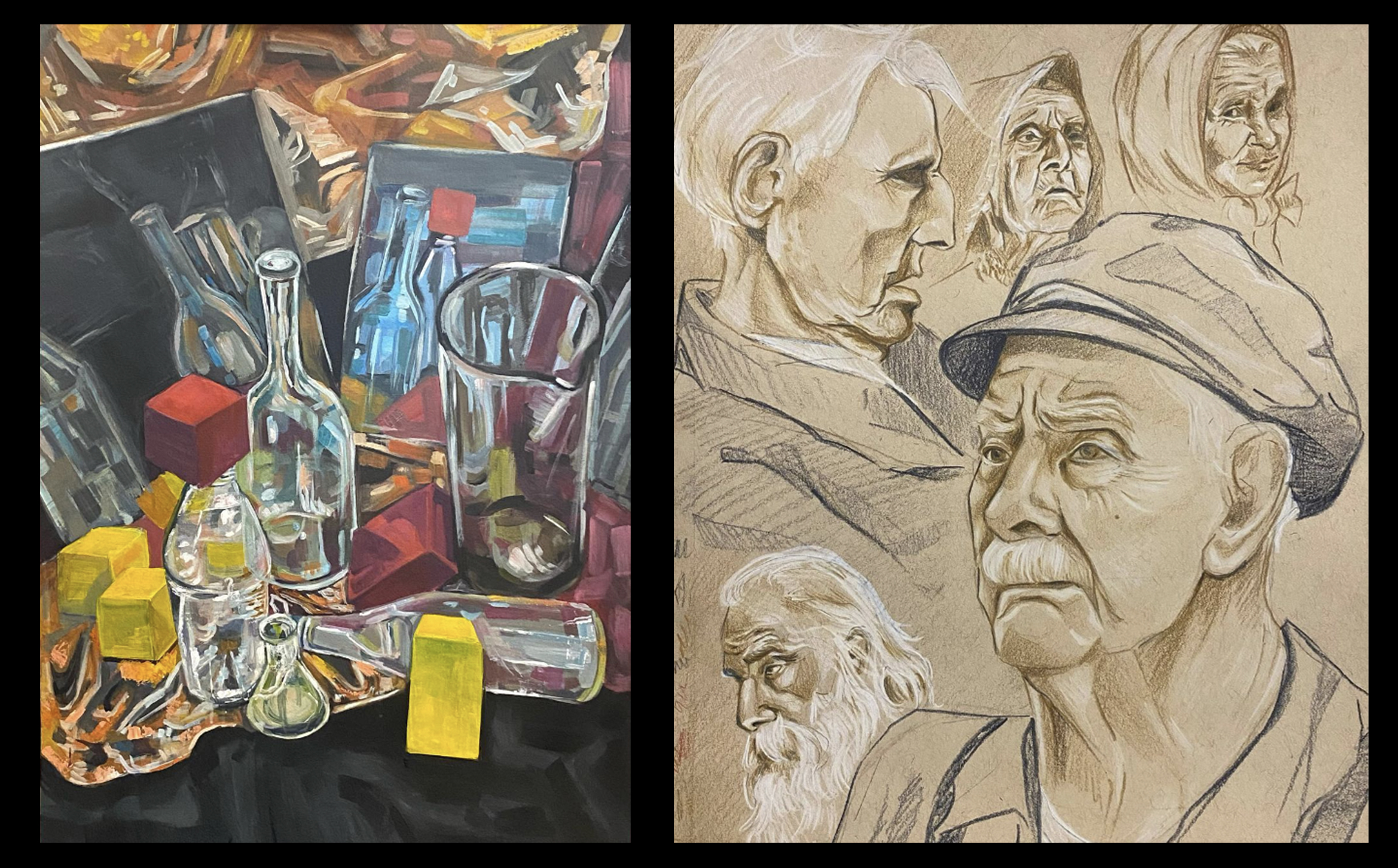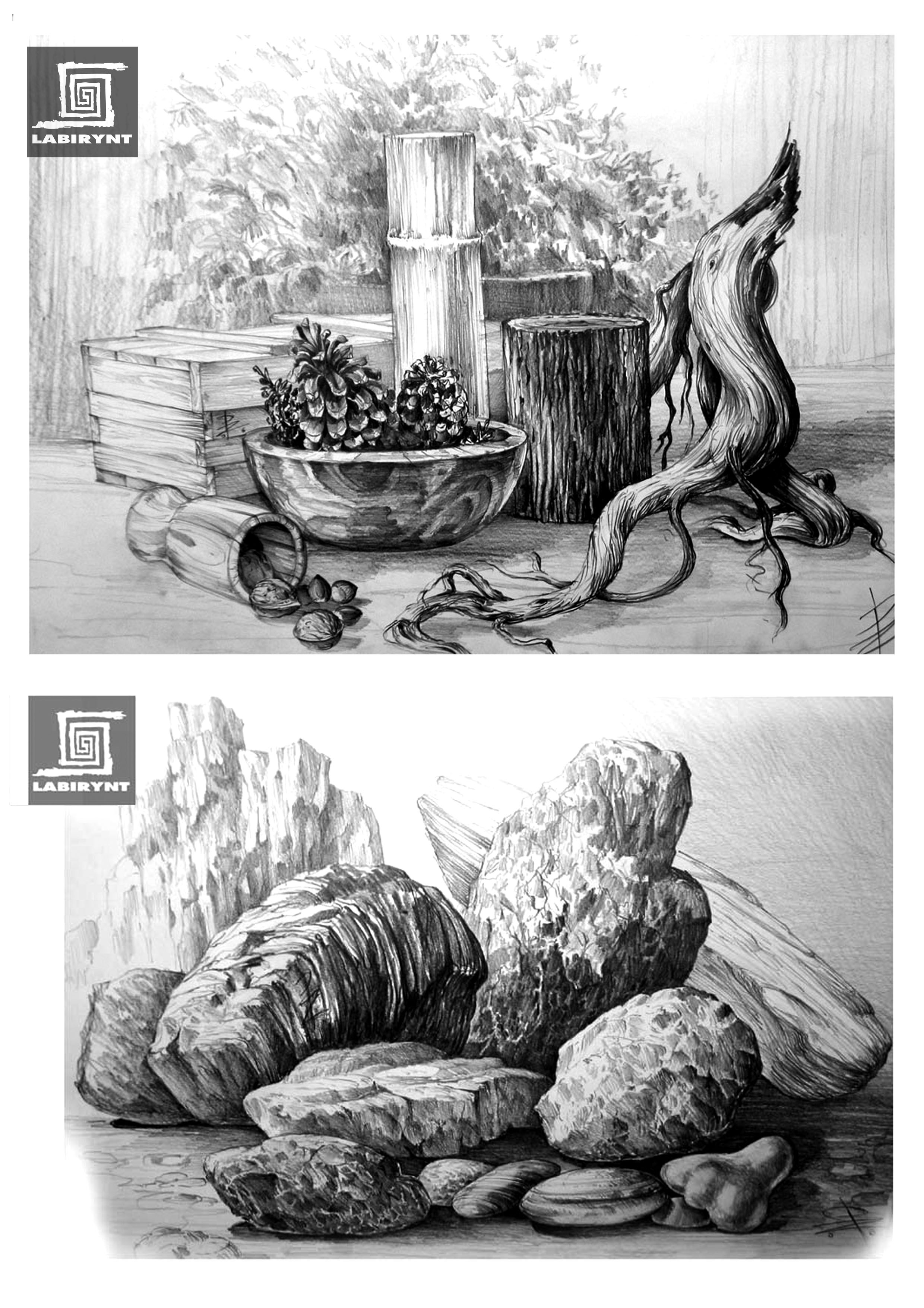 rozwiązują zadania rysunkowe z wyobraźni jak i rysują zestaw modeli brył. Na każdych zajęciach wykonujemy kilka szkiców i jeden lub dwa rysunki „główne”.